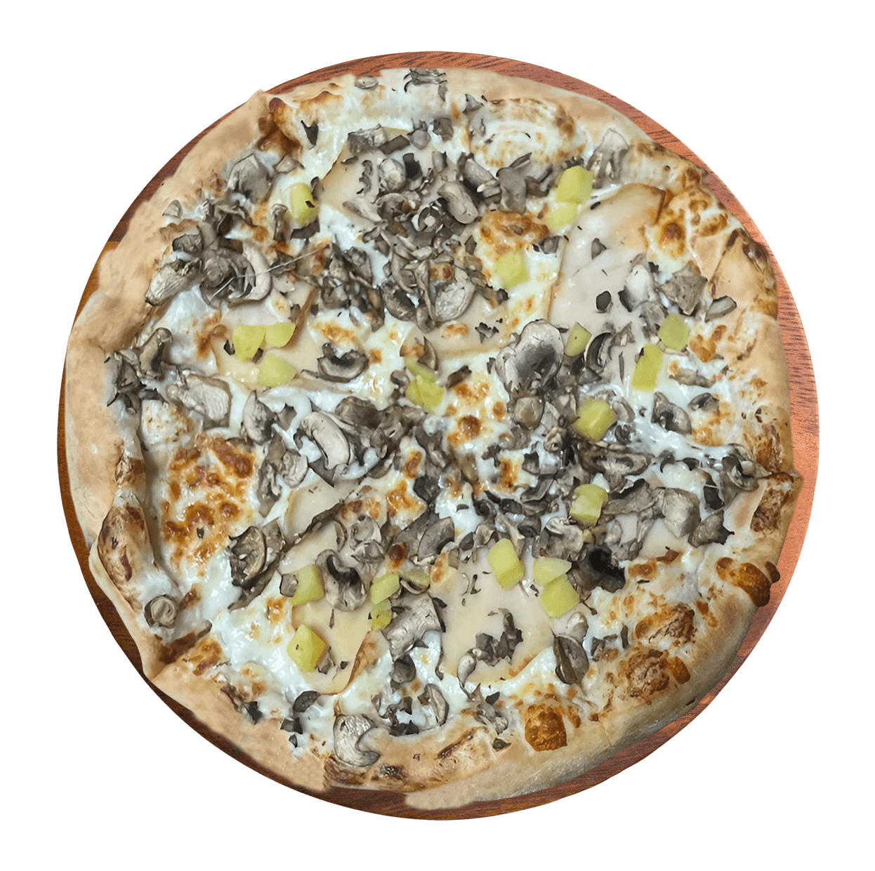 Crème fraîche, mozzarella, poulet, pommes de terre, champignons.