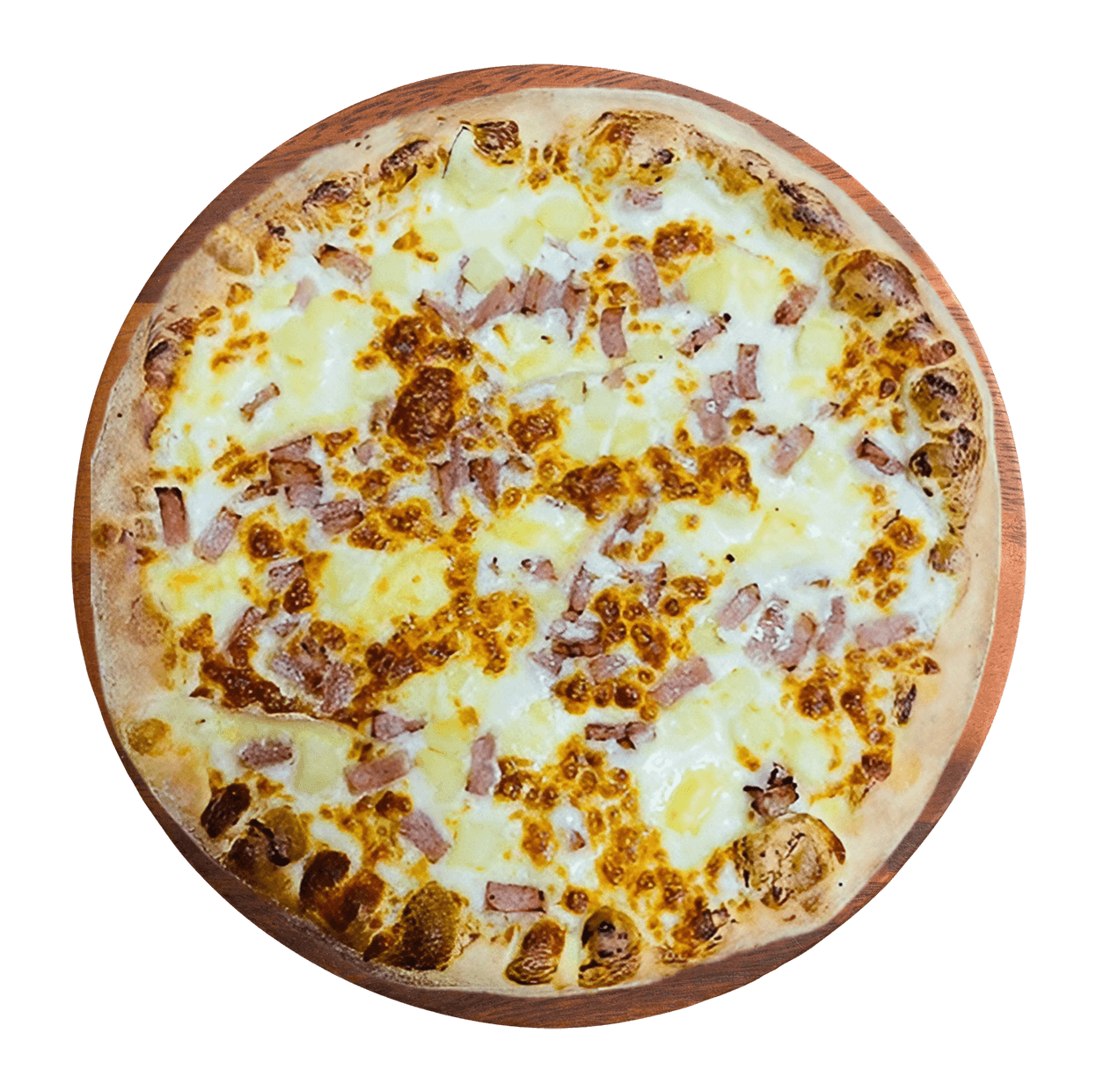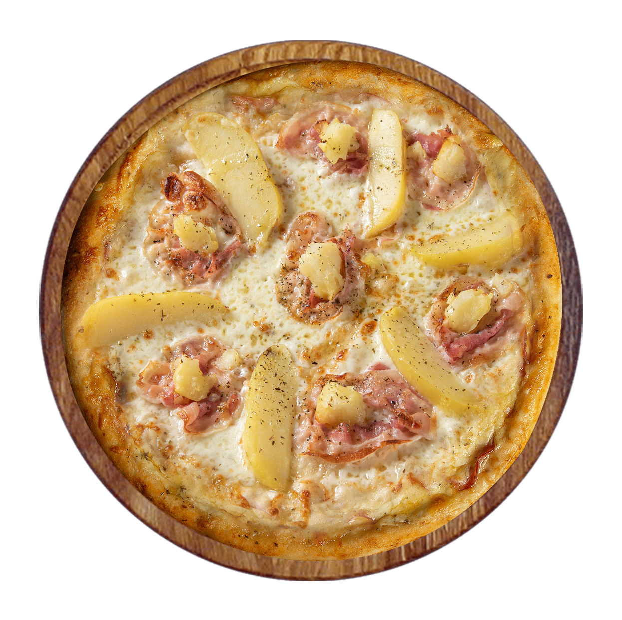 Crème fraîche, mozzarella, jambon, pommes de terre, oignons, parmesan.
