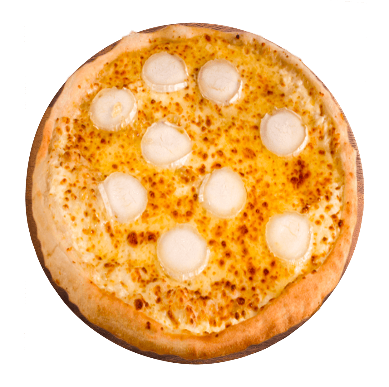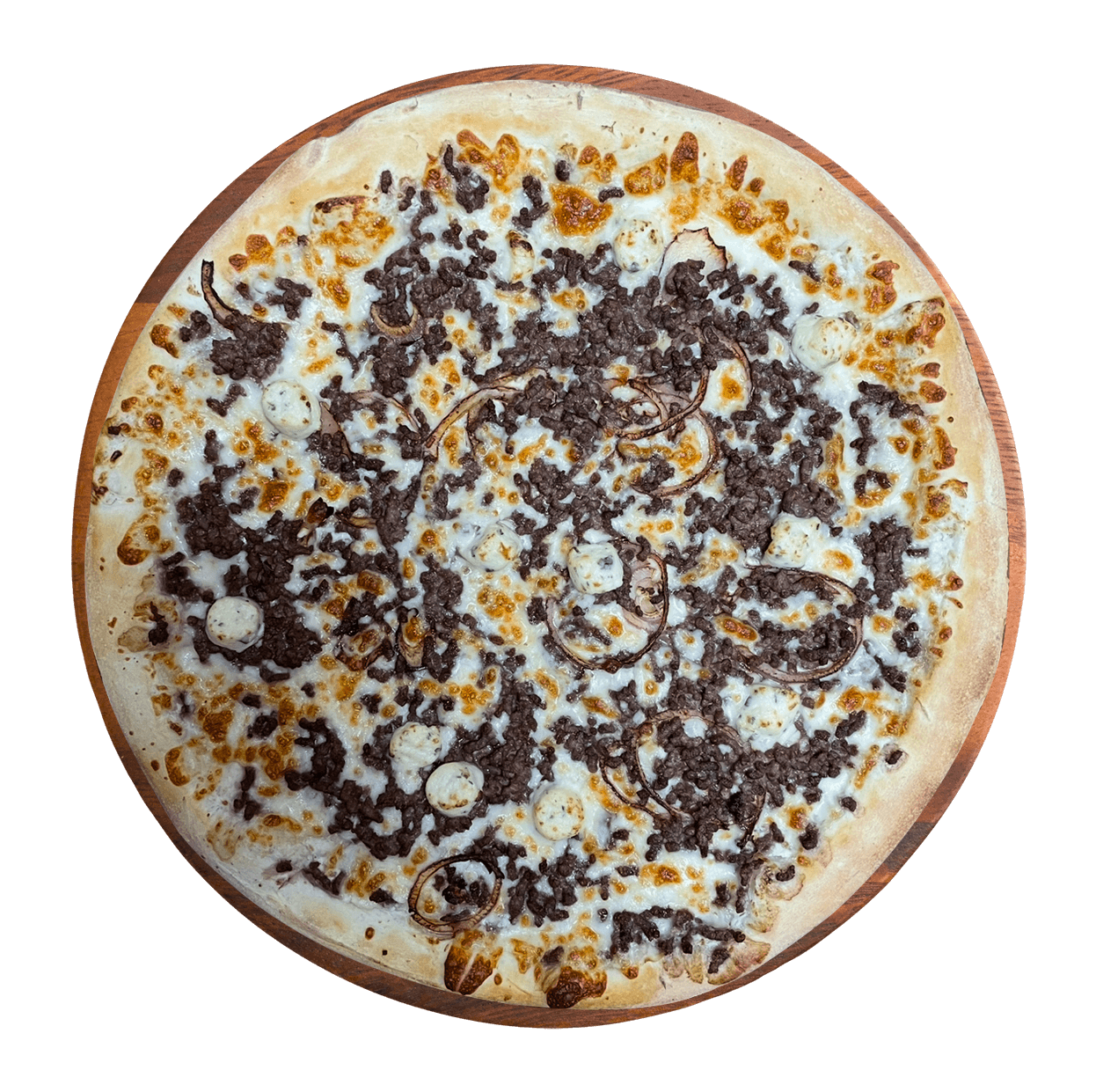 Crème fraîche, mozzarella, viande hachée, oignons, boursin.