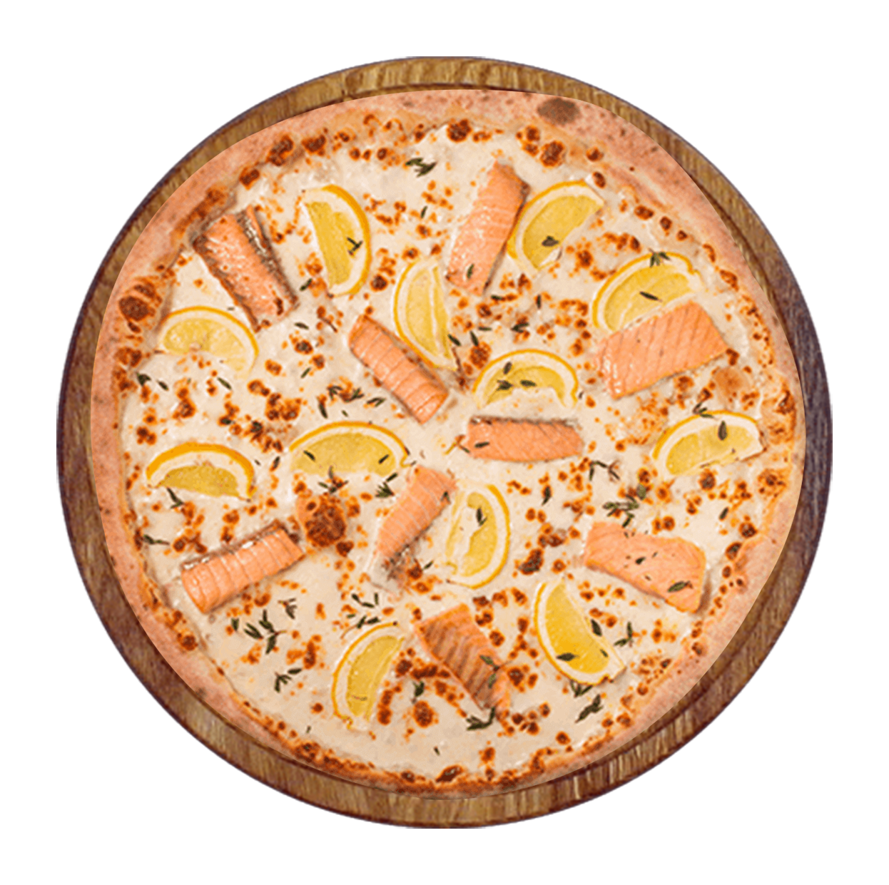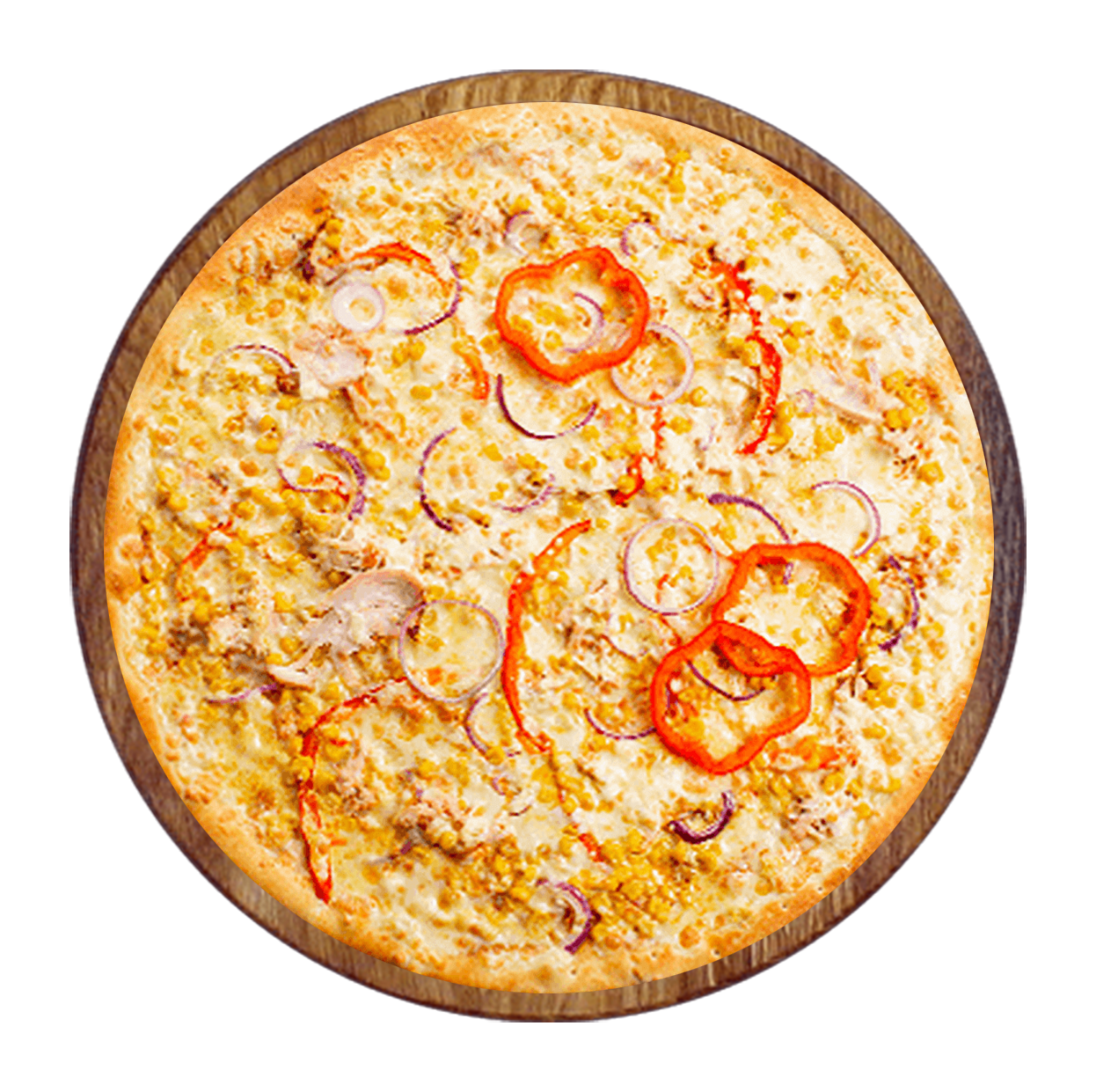 Crème fraîche, mozzarella, poulet mariné, poivrons, oignons.
